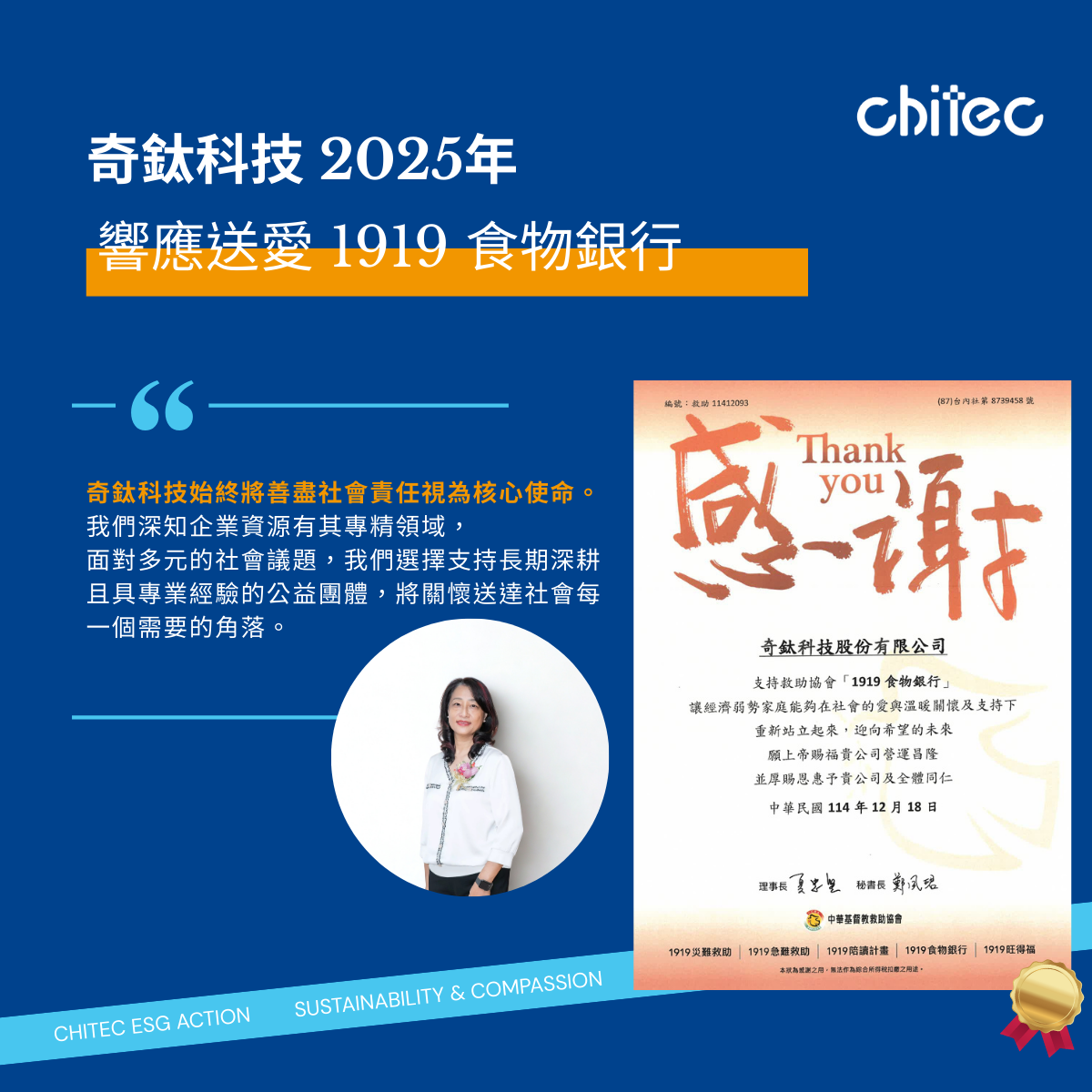 致力於特用化學品創新與永續發展的奇鈦科技,於 114 年底再度響應由證券櫃檯買賣中心發起之「櫃買家族攜手挺公益—送愛 1919 食物銀行」捐助活動。