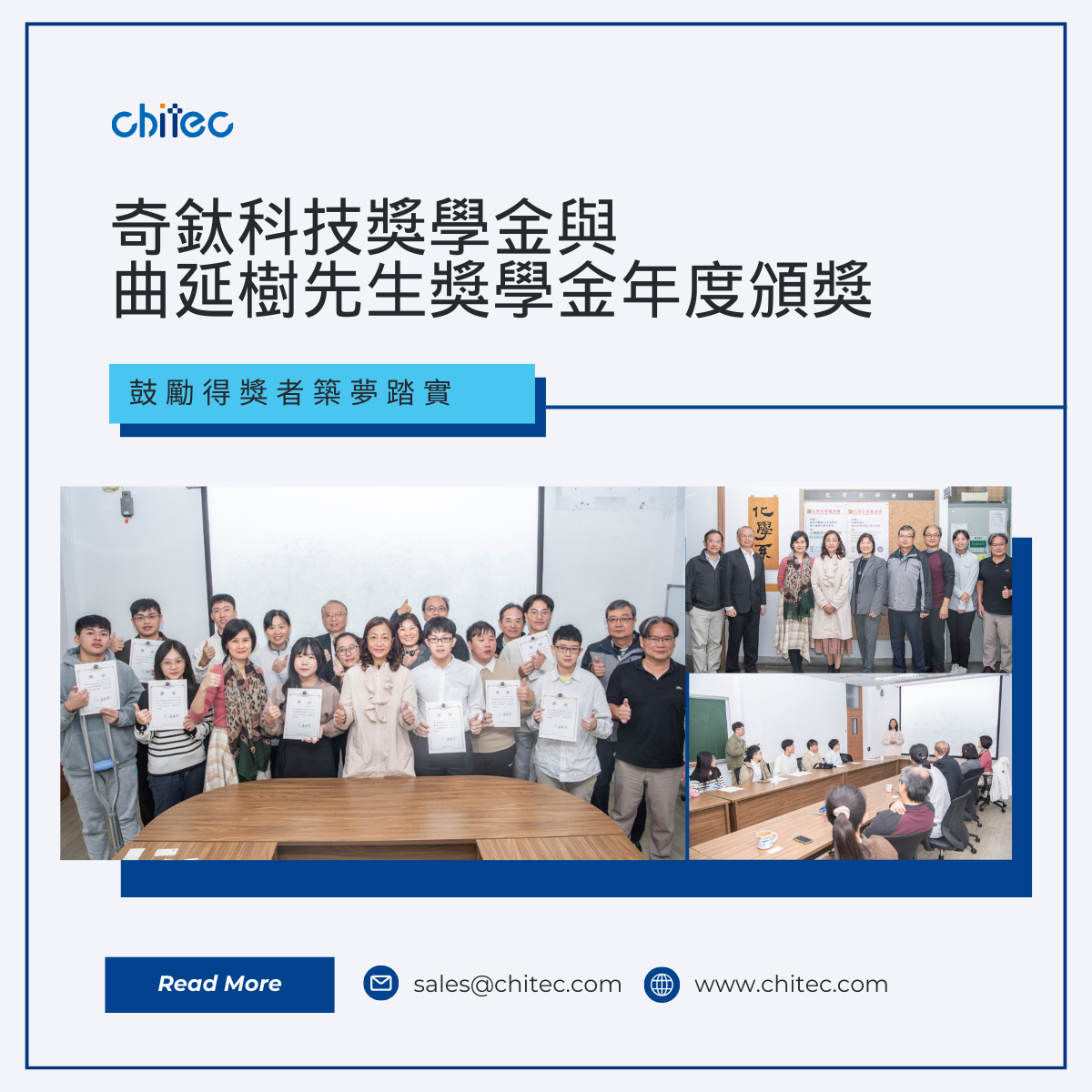2024年12月9日「2024年度奇鈦科技獎學金與曲延樹先生獎學金」頒獎典禮於國立臺灣師範大學化學系會議室進行,本公司龍筱芬董事長獲邀親臨頒獎。典禮由化學系系主任李祐慈教授主持,多位系上教授出席觀禮。