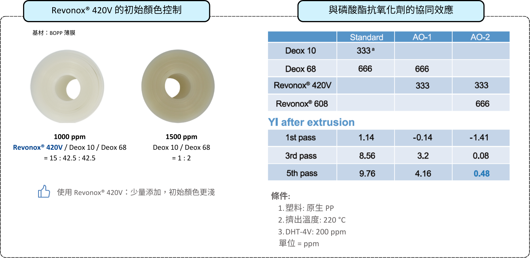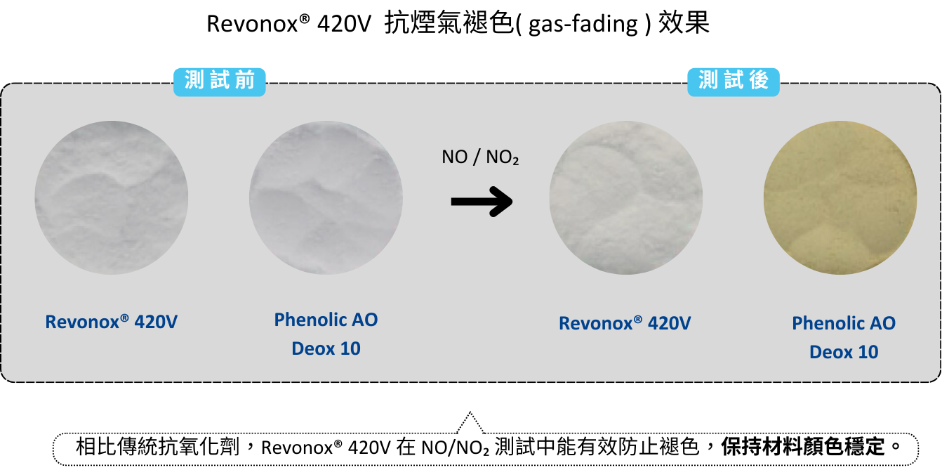 優異的協同效應性能表現 當 Revonox® 420V 與磷系抗氧化劑進行複配時會產生優異的協同效應,在塑膠熱加工製程中提供初始顏色和物理性能保護。與傳統的受阻酚類抗氧化劑體系相比,Revonox® 420V 優異的綜合性能特別適用於聚乙烯(PE)與聚丙烯(PP)的纖維或薄膜,和汽車用熱塑型聚烯烴以及一般的聚烯烴等的應用。